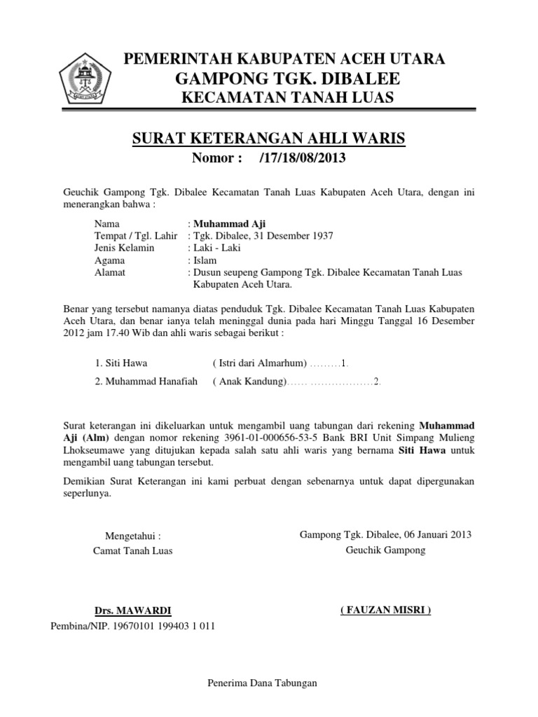 Contoh surat ahli waris untuk bank bri. Contoh surat ahli waris untuk bank yang baik dan benar. Surat ini biasanya dibuat oleh seorang anak atau anggota keluarga yang berhak menerima warisan dari orang yang telah meninggal dunia. Tuesday 30th august 2016 01 29.