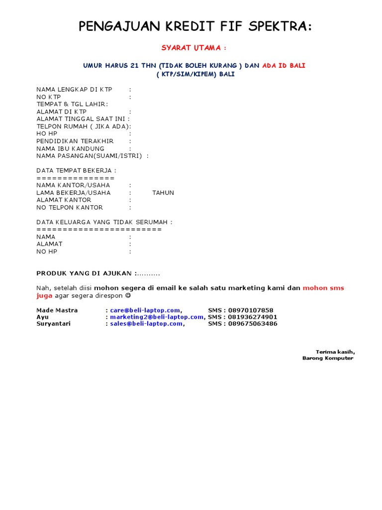 Syarat & Ketentuan Cicilan FIF * Untuk calon customer SPEKTRA yang belum memiliki KBS (KartuBelanja SPEKTRA), akan dijadwalkan kunjungan dari Tim Federal ...