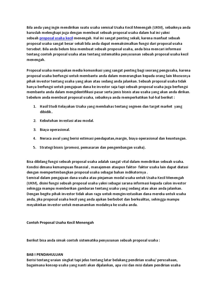 Contoh proposal studi kelayakan bisnis. skro l.net http://www.skro l.net/2013/02/contoh -proposal -bisnis -plan.html Bisnis p lan Contoh proposal bisnis plan Latif Ramadan Diposkan oleh Latif Ramadan ... https://proposal usahaku.com/contoh -proposal -studi -kelayakan -bisnis -skb/. http://rizkamaulita6.blogspot.com/2017/12/contoh -proposal -studi -kelayakan -bisnis . 01/12/2009 · 6.4 STUDI KELAYAKAN • Setiap proposal proyek harus dievaluasi kelayakan nya dari berbagai segi : Kelayakan Teknis Kelayakan Operasional Kelayakan Ekonomi 41. 41 ANALISIS DAN PERANCANGAN SISTEM INFORMMASI ♦ Kelayakan Teknis Apakah teknologi yang dibutuhkan sudah tersedia? Nov 08, 2019 · Namun ada beberapa hal penting sesuai dengan jenis bisnis yang perlu kita masukan kedalam proposal studi kelayakan bisnis , berikut contoh studi kelayakan bisnis sederhana: Studi kelayakan panel surya Dalam penerapan studi kelayakan bisnis pada penggunaan panel surya contoh nya, aspek lingkungan tidak perlu ditinjau karena memang tidak ada efek ...