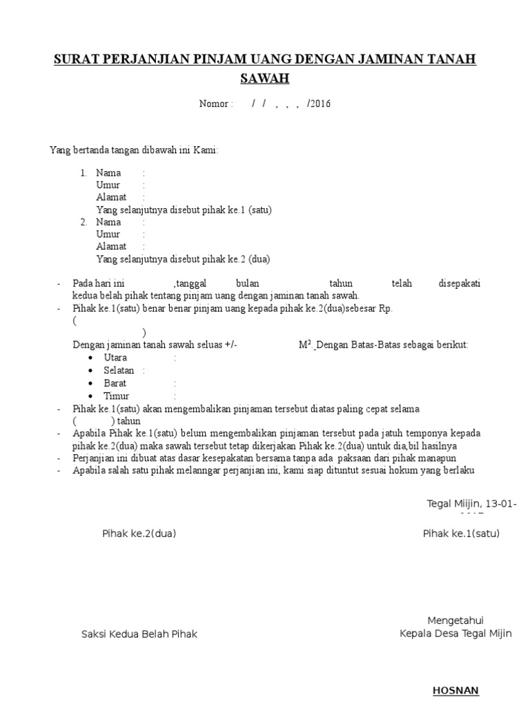 Dan apabila uang yang dipinjam tidak dikembalikan maka tanah tersebut akan dilelang Demikian Perjanjian ini dibuat dan ditandatangani oleh Para Pihak dalam keadaan sadar, sehat jasmani dan rohani, serta tanpa adanya paksaan dari pihak mana pun, pada hari, tanggal, bulan, dan tahun yang telah disebutkan pada awal Perjanjian ini. Berikut ini Contoh Surat yang baik dan benar serta menarik perhatian yang dapat anda gunakan dalam tema maupun format penulisan surat. Dalam Contoh Surat Perjanjian Pinjaman Uang Tanpa Jaminan, Gawe CV telah memilihkan tema atau template yang terbaik untuk dijadikan inspirasi, ide ataupun acuan dalam penulisan surat anda.