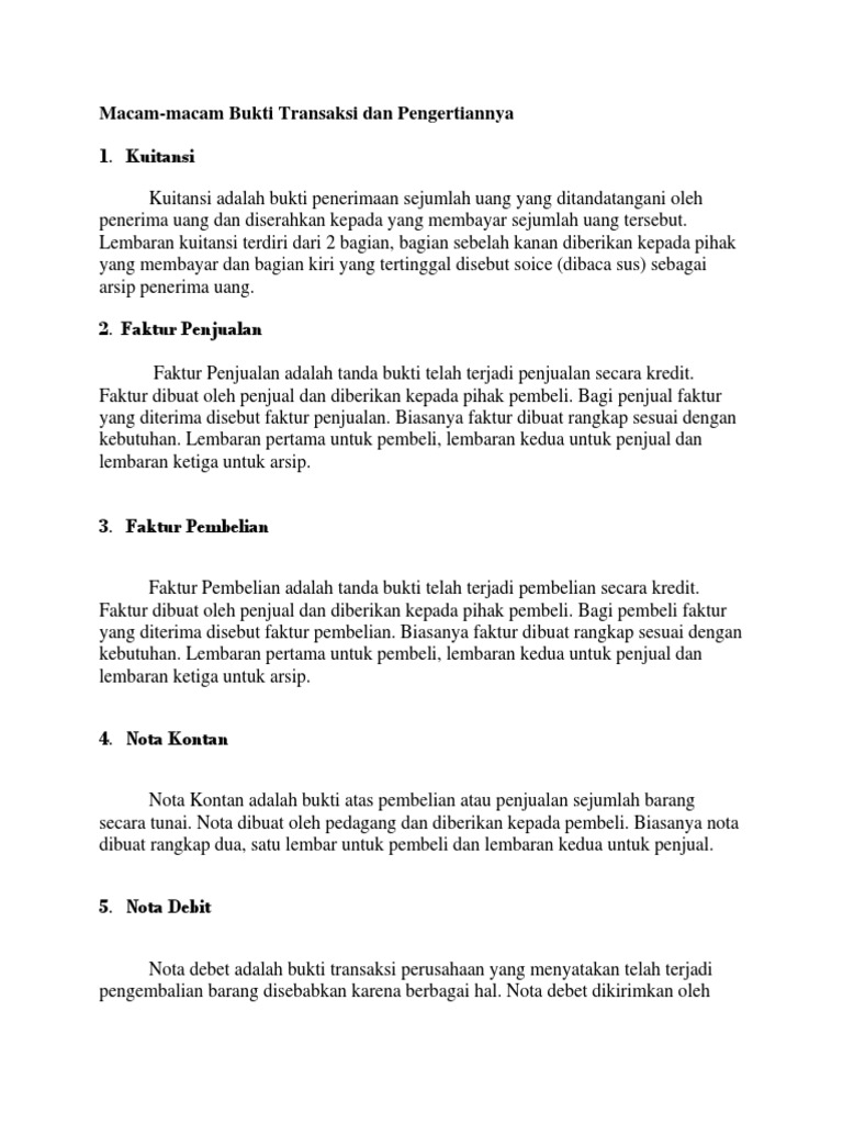 Aug 27, 2021 · Bukti transaksi yang sah adalah bukti transaksi yang berisi data tentang.Tanggal nomor bukti keterangan pihak-pihak yang terlibat b. Bukti transaksi merupakan dokumen dasar transaksiyang berguna untuk sumber pencatatan dan penyusunan laporan keuangan baik yang dibuat sendiri maupun yang berasal dari pihak luar perusahaan.