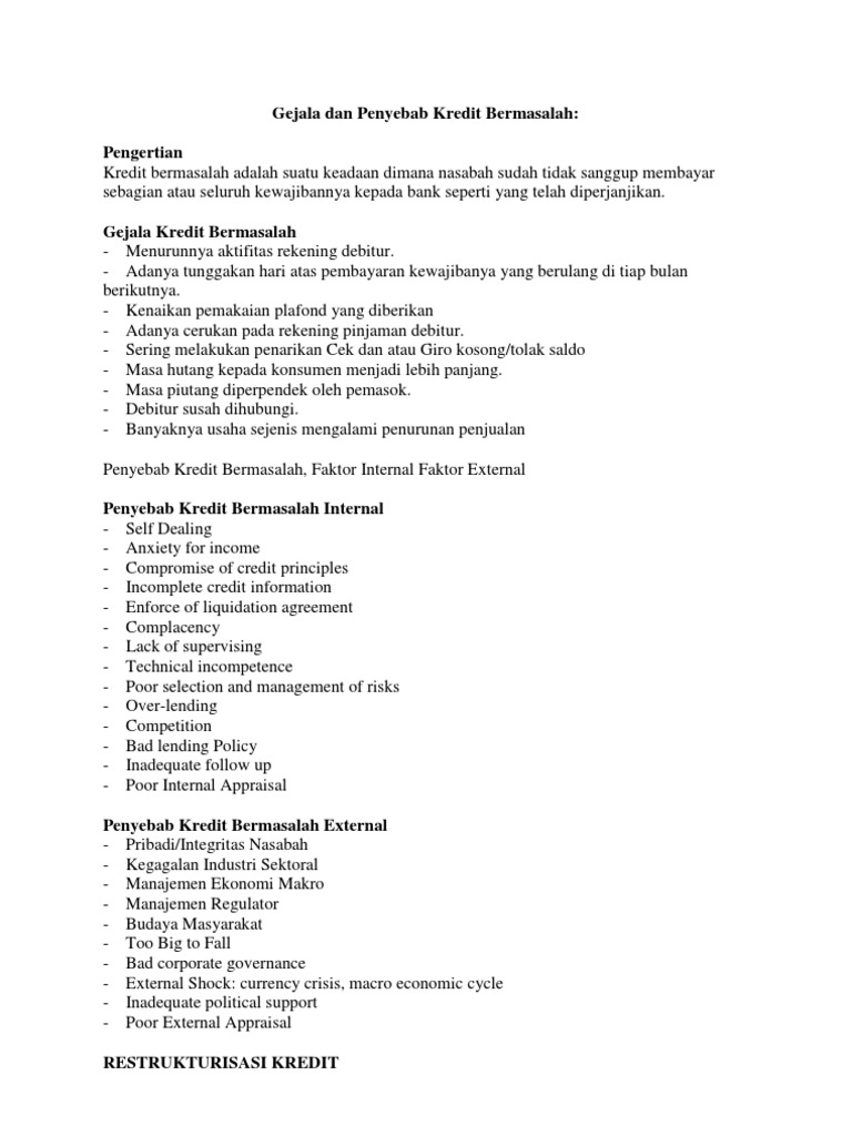 Pengertian kredit macet menurut para ahli. Pengertian kredit macet adalah kredit yang tidak lancar yang sudah jatuh tempo namun belum dapat diselesaikan oleh nasabah yang bersangkutan.(Muchdarsyah Sinungan : 1993) Definisi kredit macet adalah kredit atau piutang yang tak tertagih yang mempunyai kriteria kurang lancar, karena diragukan atau mengalami kesulitan dalam pelunasannya dikarenakan adanya faktor-faktor tertentu. Pengertian KMKP Menurut Para Ahli : KMKP singkatan dari Kredit Modal Kerja Permanen. Pengertian KMKP adalah jenis kredit yang diberikan kepada para wirausahawan atau pengusaha pribumi yang golongan ekonominya masuk ke dalam kategori lemah, di mana kredit ini dimaksudkan untuk membiayai barang-barang modal untuk keperluan modal kerja yang dibutuhkan, seperti: pengadaan bahan baku, bahan ... Di mana kredit bermasalah digolongkan menjadi tiga, yaitu kredit kurang lancar, kredit diragukan, dan kredit macet. Kredit macet inilah yang sangat dikhawatirkan oleh setiap bank, karena akan mengganggu kondisi keuangan bank, bahkan dapat mengakibatkan berhentinya kegiatan usaha bank. Pengertian Kredit Macet Menurut Para Ahli 1. Surat Keputusan Direktur Bank Indonesia No. 30/267/KEP/DIR. Kredit macet terjadi apabila terdapat tunggakan angsuran pokok dan/atau bunga yang telah melampaui 270 hari, atau kerugian operasional ditutup dengan pinjaman baru, atau dari segi hukum maupun kondisi pasar, jaminan tidak bisa dicairkan pada ...