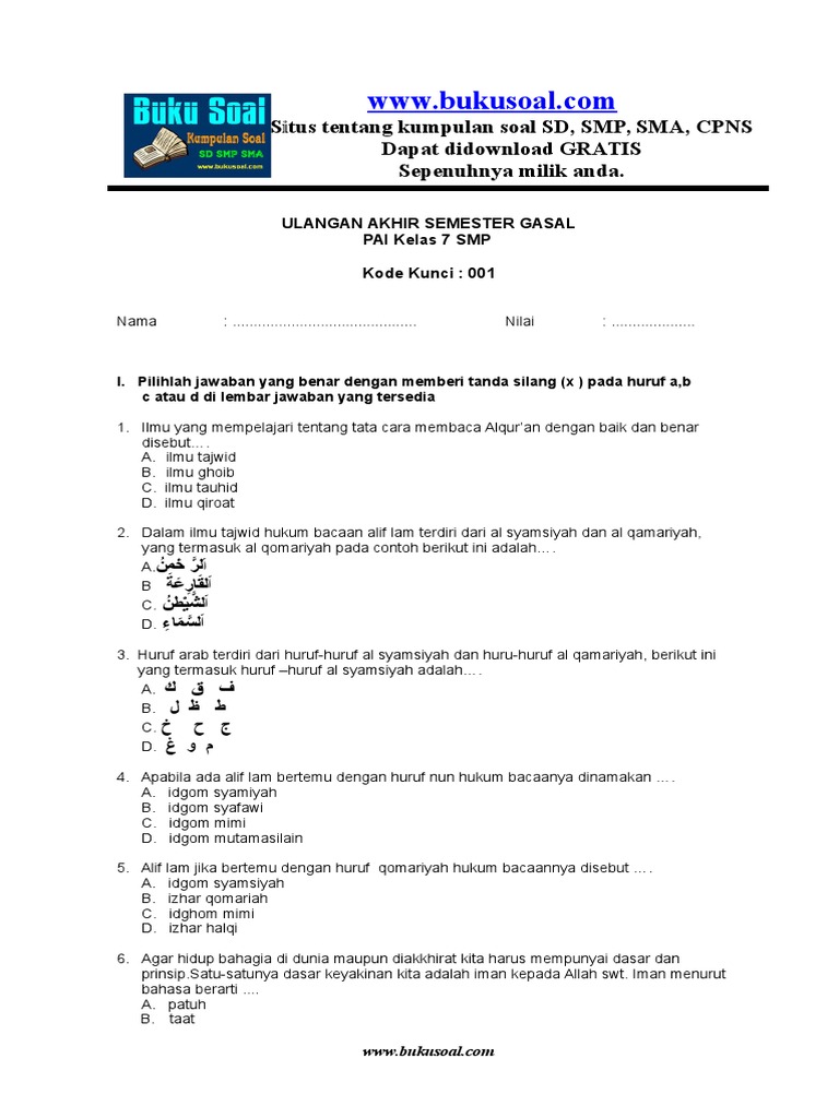 Bank soal agama islam sma dan kunci jawaban. Kumpulan soal soal sd smp sma. Kunci jawaban pendidikan agama islam dan budi peke. Dipublikasikan 15 november 2018 di update 15 november 2018. Soal agama islam kelas 8 semester 1 kurikulum 2013 ini belum dilengkapi beserta kunci jawaban pai kelas 8.