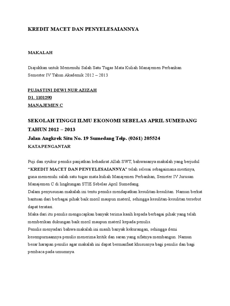 Contoh kasus kredit macet. by ZW Mardika · 2016 · Cited by 2 — PEMBENTUKAN POHON KLASIFIKASI BINER DENGAN ALGORITMA CART (CLASSIFICATION AND REGRESSION TREES) (Studi Kasus: Kredit Macet di PD. BPR-BKK Purwokerto Utara) by N Adiana · 2017 — ... dalam perjanjian kredit dengan jaminan fidusia (studi kasus: pt ... fidusia tersebut dan cara penyelesaian apabila kredit bermasalah. 19 Aug 2021 — Di sisi lain, suku bunga kredit baru perbankan di semua kelompok bank kembali naik ... di tengah peningkatan kasus Covid-19 pada Juni 2021. 14-05-2015 · Penyebab kredit macet adalah Klasifikasi Kemungkinan Penyebab Factor Eksternal Lingkungan usaha debitur Musibah atau kegagalan usaha Persaingan antar bank yang tidak sehat Faktor Internal Kebijakan perkreditan yang kurang menunjang Kelemahan system dan prosedur penilaian kredit Pemberian dan pengawasan kredit yang menyimpang dari prosedur Itikad yang kurang baik dari …