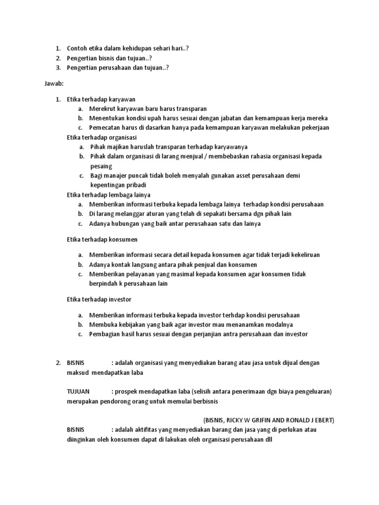 Tujuan Penerapan Etika Usaha dan Tata. Perilaku. 1) Memberi panduan kepada Perusahaan dalam menjalankan kegiatan bisnis sesuai standar etika usaha untuk.98 pagesMissing: contoh | Must include: contoh