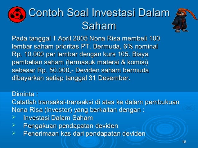 Contoh soal soal investasi utang diposting oleh iyandri tiluk wahyono di 0122 rabu 25 mei 2011 soal 1. Akuntansi mengenal dua metode untuk mencatat kegiatan investasi saham ini yakni metode cost dan metode ekuitas equity. Contoh soal dan jawabannya jurnal hingga neraca saldo akuntansi bidang jasa. Latihan soal dan jawaban investasi saham.