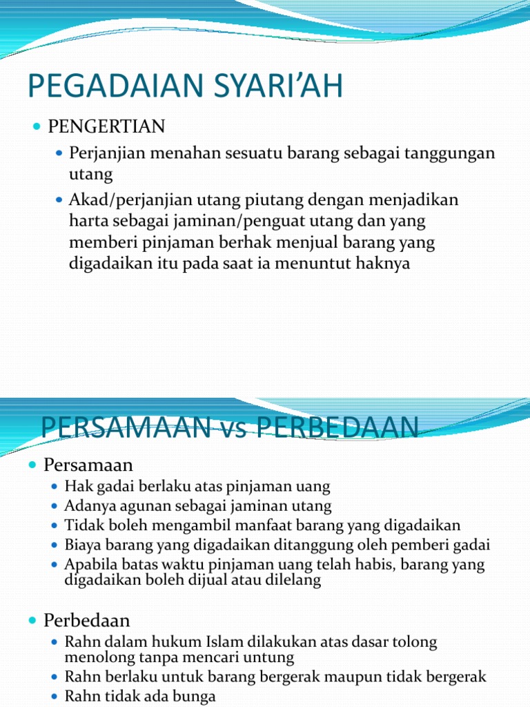 Perbedaan Gadai Syariah dan Gadai Konvensional. Produk Syariah kini semakin banyak muncul beberapa tahun kemarin. Bahkan pegadaian pun sudah mengeluarkan produk berbasis Syariah. Pegadaian jenis itu disebut Pegadaian Syariah alias Ar Rahn. Pegadaian sendiri bisa menjadi salah satu cara untuk menyelamatkan keuangan perusahaan.