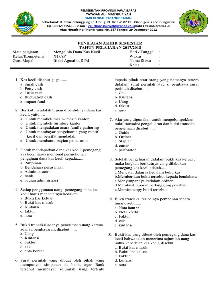 Transaksi pengisian kembali dana kas kecil dokumen transaksi tersebut ialah. Question 10. SURVEY. 30 seconds. Q. Fungsi yang bertanggung jawab atas penyimpanan dan pengeluaran dana yang nominalnya sedikit sesuai dengan otorisasi dari pejabat tertentu yang ditunjuk, dan permintaan pengisian kembali dana kas kecil, disebut fungsi. answer choices. 18. Transaksi pengisian kembali dana kas kecil, dokumen transaksi tersebut ialah. . . a. Bukti pengeluaran kas kecil yang memakai nama b. Surat permintaan ... Transaksi pengisian kembali dana kas kecil, dokumen transaksi tersebut ialah. . . ... b. Surat permintaan pengisian kembali dana kas kecil sebagai dokumen pendukung. c. Bukti- bukti penggunaan dana seperti kontan dan kuitansi. d. Adanya surat keputusan kepala bagian keuangan ... Pengisian dana tersebut disebut system…. a. Fluktuasi. b. Rutin ... c. Transaksi pengisian kembali dana kas kecil, dokumen transaksinya adalah sebagai berikut: Bukti pengeluaran kas yang dibuat bagian hutang.