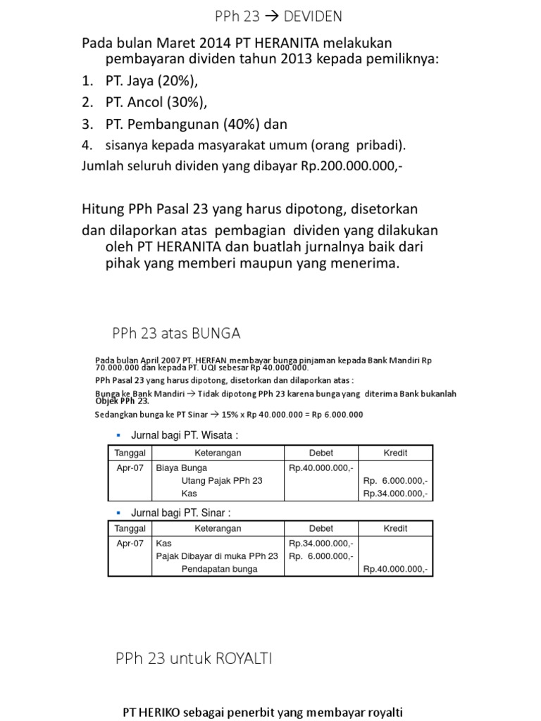 Mar 11, 2021 · Pajak atas bunga pinjaman yang diterima oleh wajib pajak dalam negeri dengan ketentuan PPh pasal 23 akan dipotong dengan tarif 15% dari jumlah brutonya.. Namun pembayaran pajak atas bunga pinjaman bank tidak dikenakan PPh pasal 23, karena termasuk penghasilan yang akan dibayarkan atapun terutang kepada bank atas pengecualian PPh pasal 23.