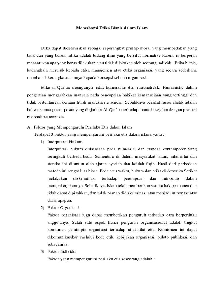 Etika bisnis islam pdf. 17 Pengertian Etika Menurut Para Ahli - Fungsi dan Contoh - Untuk pembahasan kali ini kami akan mengulas mengenai Etika yang dimana dalam hal ini meliputi pengertian menurut para ahli, fungsi dan contoh, nah agar dapat lebih memahami dan dimengerti simak ulasan selengkapnya dibawah ini. Download file PDF Read file. Download file PDF. Read file. Download citation. Copy link Link copied. ... Dasar hukum dari etika bisnis islam terletak pada Al-Qur'an Surah Al-Baqa rah ayat 282 ... Salah satu contoh kasus yang ada di indonesia yaitu program csr yang dilakukan oleh pt. Analisis corporate sosial responsibility dalam perspektif etika bisnis islam (studi kasus pt. Metode penelitian yang digunakan adalah metode kualitatif dengan pendekatan studi kasus. Teknik pengumpulan data dengan cara observasi, wawancara . Mustofa, I. (2020). Model Ijtihad Kolektif-Integratif: Upaya Pengembangan Fiqh Mu'amalah Kontekstual sebagai Landasan Pengembangan Produk Lembaga Bisnis Syariah. IAIN Metro. Muzakki, H. (2019). Mengukuhkan Islam Nusantara: Kajian Sosiologis-Historis. An-Nuha: Jurnal Kajian Islam, Pendidikan, Budaya Dan Sosial, 6(2), 215-239.