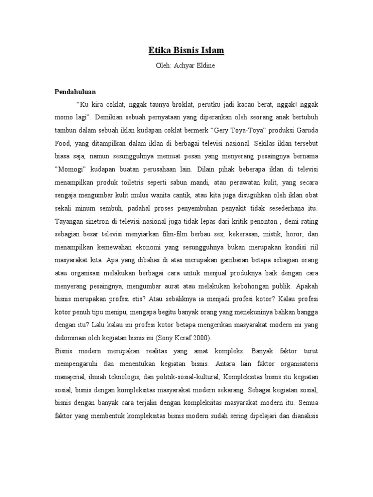 Islam memiliki pedoman dalam mengarahkan umatnya untuk melaksanakan suatu amalan. Pedoman tersebut adalah Al-Qur'an dan Sunah Nabi. Sebagai sumber ajaran, Islam setidaknya dapat menawarkan nilai-nilai dasar atau prinsip-prinsip umum yang penerapanya dalam bisnis disesuaikan dengan perkembangan zaman. Pengertian Etika Bisnis. Etika bisnis adalah aturan yang tidak tertulis tentang benar dan tidaknya dalam menjalankan suatu bisnis yang mencakup segala aspek kegiatan bisnis baik itu individu, perusahaan dan masyarakat.. Contoh etika bisnis yang dijalankan dalam suatu perusahaan dapat memberikan nilai kepada semua pegawainya tentang norma dan perilaku baik karyawan sampai level pimpinan sekaligus. Etika bisnis dalam berbisnis ada beberapa hal yang harus kita perhatikan dantarnya adalah aturan dan etika dalam berbisnis. Dalam kasus ini pt. ... Pdf Urgensi Etika Bisnis Dalam Wujudkan Tanggung Jawab ... Penerapan Etika Bisnis Islam Dalam Industri Perbankan Syariah Contoh Kesimpulan Makalah Etika Bisnis Makalah Etika Komunikasi Bisnis Pdf - Tujuan etika komunikasi bisnis. Dra hj amelia rahmi m pd disusun oleh. Ilmu komunikasi dosen pengampu. Umma ulfia rohmah 1601016120 fakultas dakwah dan komunikasi universitas islam negeri walisongo semarang 2016 pendahuluan dalam kehidupan sehari hari tentunya kita perlu memperhatikan etika.