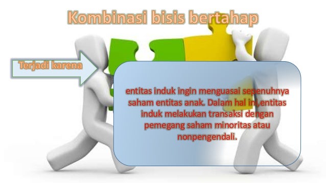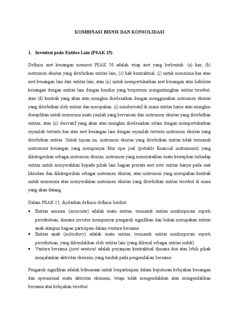 Kombinasi bisnis dan konsolidasi. 2.1 Kombinasi Bisnis dan Konsolidasi Menurut PSAK 22, kombinasi bisnis adalah suatu transaksi atau peristiwa lain dimana pihak pengakuisisi memperoleh pengendalian atas satu atau lebih suatu View Notes - Kombinasi Bisnis dan Konsolidasi from ACCT 2 at Universitas Indonesia. Kombinasi Bisnis dan Konsolidasi Jeffrey R 1506774112 Marcellina Cynthia C 1506774163 Rahmi Amelia Kombinasi Bisnis dan KonsolidasiKombinasi BisnisDefinisi Kombinasi BisnisMenurut Pernyataan Standar Akuntansi Keuangan (PSAK) No.22 revisi tahun 2010 ... kombinasi dan konsolidasi bisnis internasional Suatu kombinasi bisnis terjadi apabila suatu perusahaan bergabung dengan satu perusahaan lain atau lebih menjadi satu entitas akuntansi dan entitas yang baru tersebut meneruskan aktivitas perusahaan-perusahaan terdahulu yang semula terpisah (APB Opinion No. 16).