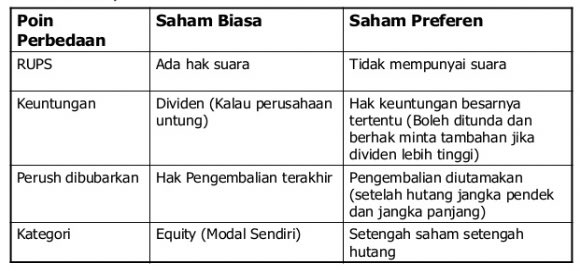 perbedaan saham biasa, saham preferen dan obligasi - Brainly.co.id -saham biasa merupakan bentuk kepemilikan yang paling banyak menarik dana dari masyarakat. - saham preferen adalah gabungan dari karakteristik saham biasa dan obligasi. Saham preferen mempunyai karakteristik saham biasa, yaitu tidak selamanya memberikan deviden bagi pemegangnya.