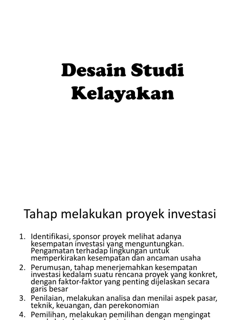 PDF Desain Studi Kelayakan - taqiyyuddinalawiy.com Studi Kelayakan Bisnis Muhammad Taqiyyuddin Alawiy 3 IDENTIFIKASI KESEMPATAN USAHA Tahap melakukan proyek investasi: 1. Identifikasi, sponsor proyek melihat adanya kesempatan investasi yang menguntungkan. Pengamatan terhadap lingkungan untuk memperkirakan kesempatan dan ancaman usaha 2. Perumusan, tahap menerjemahkan kesempatan investasi