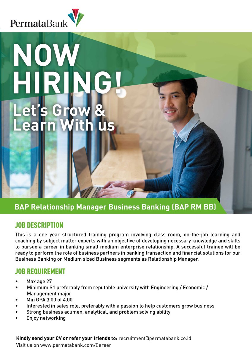 Lowongan pekerjaan terbaru berasal dari penerimaan calon pegawai di instansi Permata Bank bulan September 2020. Kembali dibuka lagi penerimaan calon Pegawai Permata Bank untuk talenta muda yang berpendidikan minimal dalam mengisi posisi jabatan menarik. Teman-teman yang berminat silakan ajukan lamaran secepatnya. Lihat lowongan karir yang cocok untukmu dibawah ini! Graduate Management Associate Program (GMAP) merupakan program yang akan membekali Kamu dengan pengetahuan dasar mengenai financial market dan produk PermataBank serta memberikan pengalaman untuk melihat lini bisnis PermataBank dengan metode on-the-job training. Tata Cara Pendaftaran :. Bagi para pencari kerja yang berminat dengan lowongan kerja PT Bank Permata Indonesia 2021 dan merasa memenuhi seluruh kebutuhan yang dipersyaratkan perusahaan untuk dapat segera melengkapi berkas lamaran kerja meliputi surat lamaran kerja , CV dan berkas pelengkap lamaran kerja lainnya yang telah dijelaskan diatas, kemudian silahkan mengikuti tata cara pendaftaran ...