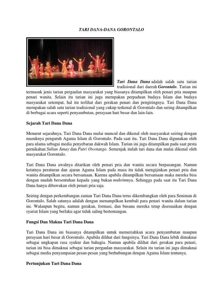 Dec 05, 2016 · Keunikannya tari ini didominasi oleh gerakan-gerakan yang dinamis mengikuti irama musik gambus dan rebana serta lagu berisi pantun bertemakan percintaan, atau nasehat – nasehat yang berhubungan dengan pergaulan remaja.Tari Dana-Dana diangkat dari Bahasa Daerah Gorontalo, yakni dari dua kata : Daya-Dayango dan Na’o-Na’o.