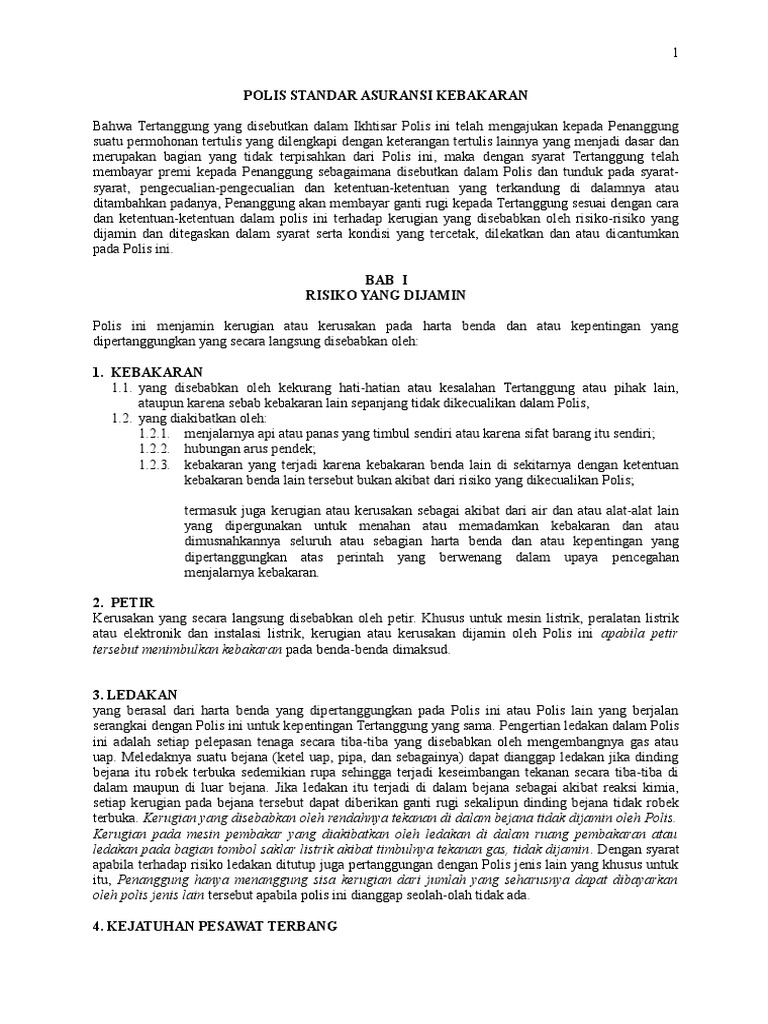Polis Standar Asuransi Kendaraan Bermotor Indonesia - Cara ... Sep 29, 2016 · Polis standar asuransi kendaraan bermotor indonesia terdiri dai 4 bab yang berisi 30 pasal. Pada bab I yang berisi tentang jaminan yang di mana isinya pada pasal satu tentang tentang jaminan kendaraan bermotor anda. Pertanggungan yang menjamin karena sebab tabrakan, benturan, kecelakaan, pencurian, kebakaran terhadap kecelakaan anda. 41 contoh polis asuransi pdf - Info Perbankan Hari Ini POLIS STANDAR ASURANSI KENDARAAN BERMOTOR INDONESIA Bahwa Tertanggung telah mengajukan suatu permohonan tertulis yang menjadi dasar dan merupakan bagian tidak terpisahkan dari Polis ini, Penanggung akan memberikan ganti rugi kepada Tertanggung terhadap kerugian atas dan/atau kerusakan pada Kendaraan Bermotor dan/atau ... Polis Standar Asuransi Indonesia - ahliasuransi.com 3) Polis Standar Asuransi Kendaraan B ermotor Indonesia / Indonesian Motor Vehicle Insurance Standard Policy. (Selengkapnya). 4) Polis Standar Asuransi Pengangkutan Barang Indonesia. (Selengkapnya). 5) Polis Standar Asuransi Gempa Bumi Indonesia/ Indonesian Earthquake Standard Policy. (Selengkapnya). POLIS STANDAR KENDARAAN BERMOTOR INDONESIA - Belajar Asuransi POLIS STANDAR KENDARAAN BERMOTOR INDONESIA. July 14, 2018 Andin. ... pada naskah antara yang tertera pada Polis ini dari yang telah diedarkan melalui Surat Keputusan Pengurus Dewan Asuransi Indonesia kepada segenap anggota Dewan Asuransi Indonesia Sektor Kerugian yang aslinya disimpan di Kantor Sekretariat Jenderal Dewan Asuransi Indonesia ...