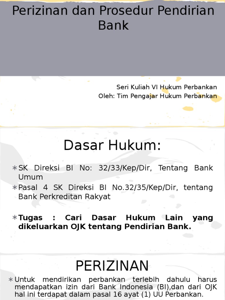Dasar Hukum Pendirian Bank - Hukum UPB Dasar Hukum Pendirian Bank. Author: Isnawati Azizatul Rahma NIK: 160710041. Hukum Perbankan adalah sekumpulan aturan hukum yang mengatur tentang kegiatan perbankan dalam lembaga keuangan. Tentu untuk memperoleh pengertian yang lebih mendalam mengenai pengertian hukum perbankan tidaklah cukup dengan memberikan rumusan yang demikian.