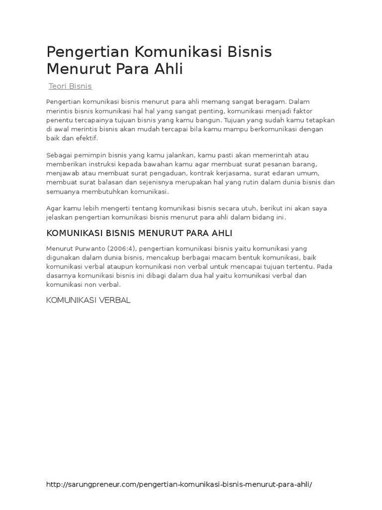 Komunikasi Bisnis ini . Adapun tujuan dari disusunnya bahan ajar ini adalah supaya para mahasiswa dapat mengetahui bagaimana mekanisme dasar dasar pelaksanaan komunikasi bisnis. Komunikasi Bisnis merupakan hal yag sangat penting agar bisnis dapat berjalan dengan lancar. Modul disusun oleh dosen untuk dipelajari mahasiswa Jan 18, 2022 · Komunikasi bisnis diperlukan oleh organisasi untuk bertukar informasi dengan pemangku kepentingan internal dan eksternal. Ini membantu dalam mencapai tujuannya secara efektif. Penyusunan rencana dan kebijakan . Melalui komunikasi bisnis yang efektif, organisasi dapat membuat rencana dan kebijakan dengan baik. Adapun pengertian komunikasi bisnis menurut beberapa ahli, diantaranya sebagai berikut: Menurut Wikipedia.org, menjelaskan pengertian komunikasi bisnisadalah pertukaran gagasan dan informasi yang memiliki tujuan tertentu yangdisajikan secara personal atau impersonal melalui simbol-simbol atau sinyal. Apayang dimaksud dengan komunikasi bisnis harus ada melibatkan pertukaraninformasi yang terus-menerus. Lebih banyak bisnis diperluas, lebih besartekanannya pada bisnis tersebut untuk menemukan cara menawar kan produk biarlebih efektif. Menurut Persing(1981:108), pengertian komunikasibisnis adalah proses penyampaian arti melalui lambang-lambang yang meliputikeseluruhan unsur-unsur yang berhubungan dengan proses penyampaian danpenerimaan pesan, baik itu dalam bentuk tulisan, lisan, maupun nonverbal. MenurutRosenbalt (1982:7), pengertiankomunikasi bisnis adalah pertukaran ide-ide opini, informasi, instruksi dansejenisnya, yang dikemukakan baik secara personal ataupun nonpersonal melaluisim... 1.Jelaskan pengertian dari Komunikasi Bisnis. Sebutkan sumber referensi yang menerangkan mengenai Komunikasi Bisnis tersebut. Jelaskan mengapa mahasiswa-mahasiswi Fakultas Ekonomi perlu memahami mengenai Komunikasi Bisnis dan bagaimana implementasinya pada saat mahasiswa-mahasiswi tersebut menangani aktivitas di dalam dunia kerja! 2.