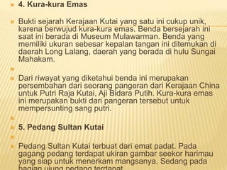 Hasil Hasil Kebudayaan Kutai | PDF | 5. Kura Kura Emas Kura kura emas ini dibuat dari emas 23 karat dengan bentuk kura kura yang juga digunakan sebagai upacara penobatan Sultan Kutai Kartanegara. Pedang Sultan Kutai terbuat dari emas padat dan pada bagian gagang diukir gambar seekor harimau yang sedang siap untuk menerkam, sedangkan...