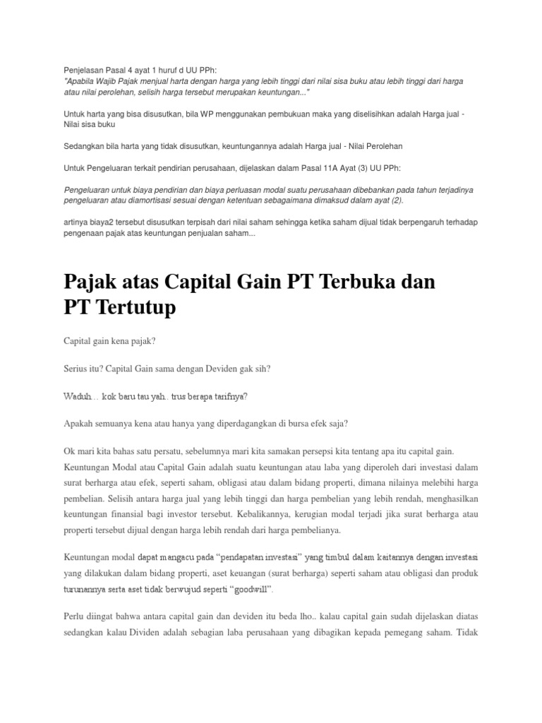 Beban Pajak Penjualan Saham Perusahaan Tertutup. Dalam hal perusahaan yang sahamnya tidak terdaftar dalam bursa efek, maka hanya ada satu aspek Pajak Penghasilan (PPh) yang akan dibebankan. Hal ini sesuai dengan Undang-Undang PPh Pasal 4 Ayat (1) huruf d angka 1 yang menyebutkan bahwa atas keuntungan (capital gain) dari pengalihan harta kepada ...
