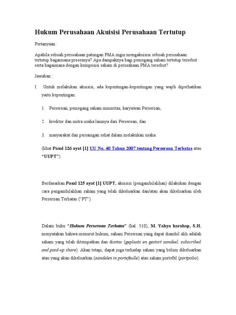 Usaha yru1.g Tertutup dan Bidang Usaha yang Terbuka ... perusahaan yang sahamnya dimiliki oleh Penanam ... Penjualan Sepeda Motor (agen/ distributor).68 pages Pemilik saham dibenarkan melakukan pengalihan atau penjualan kepemilikan sahamnya kepada pihak lain. Mekanisme penjualan saham diatur di dalam UU No. 40 tahun 2007 tentang Perusahaan. Dalam peralihan saham harus memperhatikan kepentingan perusahaan dan pemegang saham lainnya. Ada beberapa faktor penyebab pemilik saham menjual sahamnya, yakni: ARTI 'BUY BACK SAHAM' DI PT TERTUTUP DAN TERBUKA. Di Indonesia, Share Buy Back ("SBB") atau pembelian kembali saham yang telah dikeluarkan oleh perusahaan dapat dilakukan PT Tertutup dan PT Terbuka. PT Tertutup dapat melakukan SBB berdasarkan kepada Pasal 37-38 Undang-Undang No. 40 Tahun 2007 tentang Perseroan Terbatas (UUPT ... Dec 10, 2020 — bank atau perusahaan lain di bidang keuangan, seperti sewa guna usaha, modal ventura, ... suatu penjualan, pemindahan hak atas saham, hak.86 pages