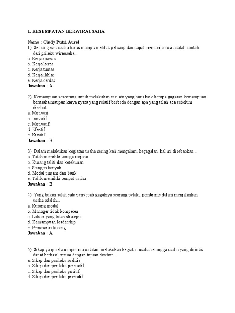 Contoh Soal Essay. 1. Jelaskan pentingnya kewirausahaan! Jawab: Kewirausahaan adalah kemampuan seorang manajer risiko untuk mengoptimalkan semua sumber daya yang tersedia, baik berwujud maupun intelektual, temporal, dan kemampuannya untuk menghasilkan produk atau bisnis yang bermanfaat bagi dirinya dan orang lain. 2. Berikut yang bukan penyebab gagalnya seorang pelaku bisnis dalam menjalankan usaha adalah; Berdasarkan skala usahanya bisnis ritel dapat diklasifikasikan menjadi dua yaitu; Kerugian yang mungkin timbul dalam kesalahan pemilihan lokasi usaha ritel adalah; Yang bukan salah satu alasan kegagalan bisnis saat menjalankan bisnis adalah Yang bukan salah satu penyebab gagalnya seorang pelaku bisnis dalam menjalankan usaha adalah a. Salah satu penyebab bisnis gagal adalah pemilik tidak menyiapkan strategi untuk memenuhi kebutuhan usaha. 21. Ada beberapa faktor keberhasilan peluang usaha. Salah satu faktor keberhasilan usaha tersebut adalah … a. Peluang usaha meniru produk orang lain b. Memiliki banyak modal c. Produk tidak perlu dilakukan uji pasar d. Memiliki strategi pemasaran yang banyak e. Peluang memiliki tingkat resiko kegagalan yang kecil bila dijalankan 22.