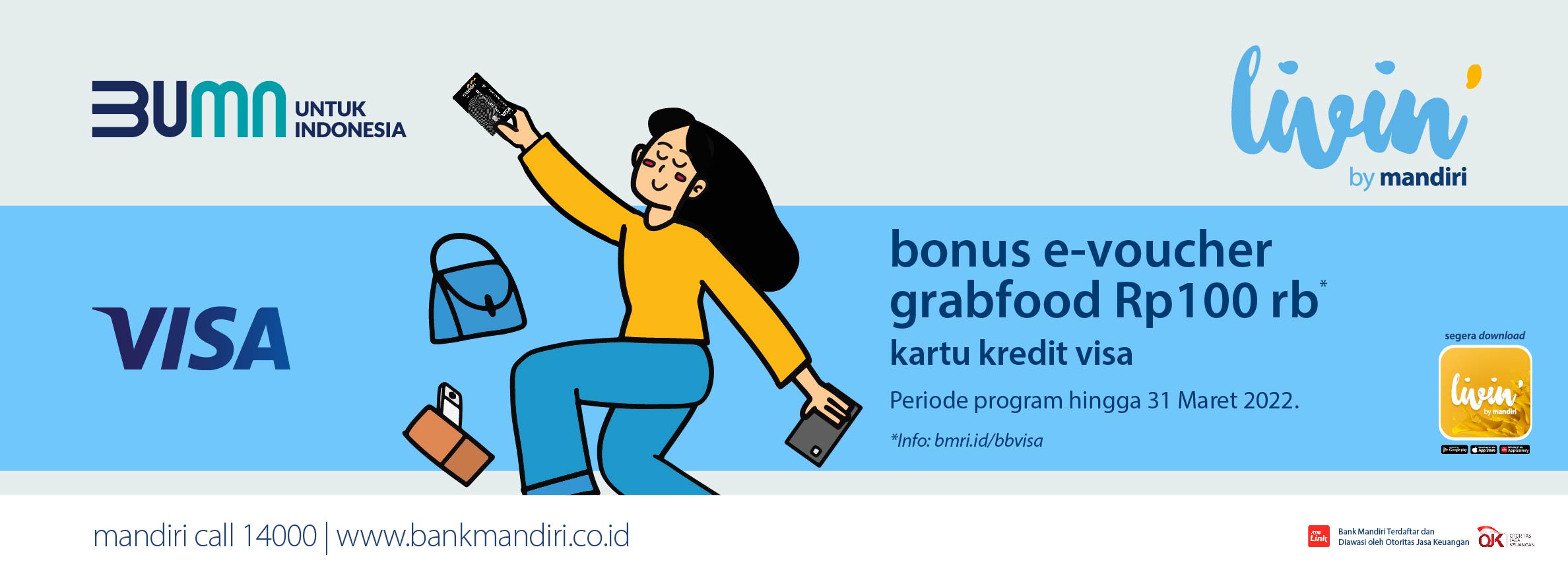Promo Kartu Kredit Visa Mandiri, Diskon Hotel & Tiket ... Pakai Kartu Kredit Visa Mandiri untuk mendapatkan diskon hotel & tiket pesawat hingga Rp 250.000 selama periode gajian ini. Periode promo ini berlaku hingga 6 Maret 2022 tetapi waktu menginap dan keberangkatan bisa sesuai dengan jadwal Anda, kapan saja! Mengutip dari pegipegi.com, inilah info lengkap promonya di bawah ini. Gandeng Indomaret, Livin by Mandiri Genjot Transaksi ... Promo ini berlaku sejak tanggal 16 sampai dengan 31 Maret 2022. Bank Mandiri berkomitmen untuk terus hadir dan berkembang bersama mitranya. "Untuk itu, ke depannya Bank Mandiri akan terus melakukan inovasi di bidang transaksi digital seiring dengan meningkatnya kebutuhan solusi baru di era teknologi informasi saat ini," jelas Josephus. (01).