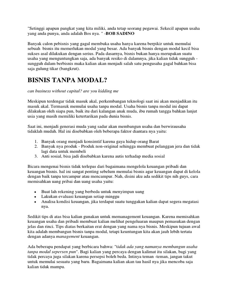 8 Cara Bisnis Tanpa Modal Sepeserpun Tanpa Resiko Terbaru ... Jul 22, 2019 · 8 Cara Bisnis Tanpa Modal Sepeserpun Tanpa Resiko Terbaru Untung Besar dengan GrabKios kudo last updated Jul 22, 2019 17 177663 Bisnis tanpa modal ternyata bisa mendatangkan banyak keuntungan yang sangat menggiurkan, asalkan Anda cerdas dalam menjalankan bisnis tersebut. Bisnis Tanpa Modal Tanpa Resiko dengan Indo Supply Chain ... Mar 02, 2021 · Bisnis Tanpa Modal Tanpa Resiko dengan Indo Supply Chain - Saya pernah berada pada masa, ingin berbisnis tapi nggak punya modal dan akhirnya berhenti bermimpi jadi pebisnis. Ternyata bisnis yang sederhana itu sangat mudah, kita tinggal memasarkan barang jadi. Nggak perlu memikirkan bagaimana cara memroduksinya, karena akan lebih njlimet. 7 Bisnis Rumahan Tanpa Modal dan Tanpa Resiko Tapi Hasilnya ... Bisnis tanpa modal sepeserpun satu ini terbilang sangat mudah, dengan waktu kerja yang fleksibel, dan dalam menjalankannya betul-betul tidak memerlukan modal sama sekali. Untuk hasil yang didapat juga tidak mengecewakan selama anda konsisten dan memiliki kredibilitas yang baik dalam membangun bisnis tanpa modal di HP satu ini.
