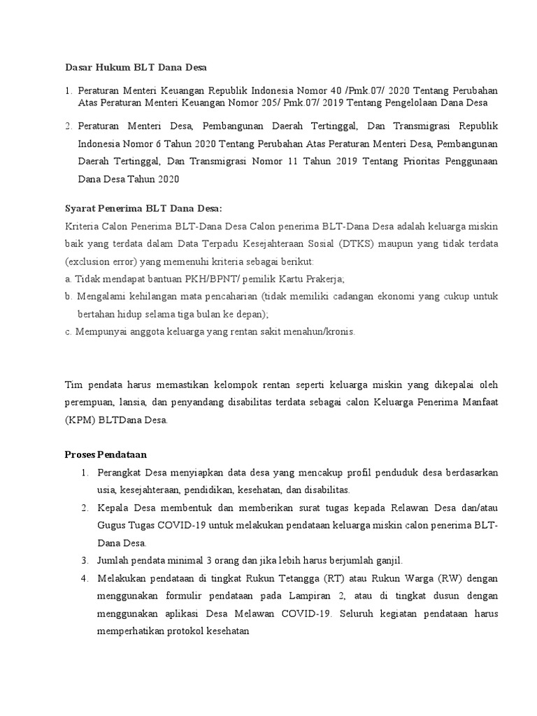Dasar Hukum, Mekanisme, Sasaran, Besaran dan Perhitungan ... Dasar Hukum, Mekanisme, Sasaran, Besaran dan Perhitungan BLT Dana Desa. Penulis. Redaksi. -. April 16, 2020. Analisaaceh.com | Dalam upaya meringankan beban masyarakat akibat dampak pandemi corona (Covid-19), Pemerintah Indonesia mengucurkan Bantuan Langsung Tunai (BLT) melalui dana desa kepada seluruh masyarakat Indonesia. Dana tersebut ...