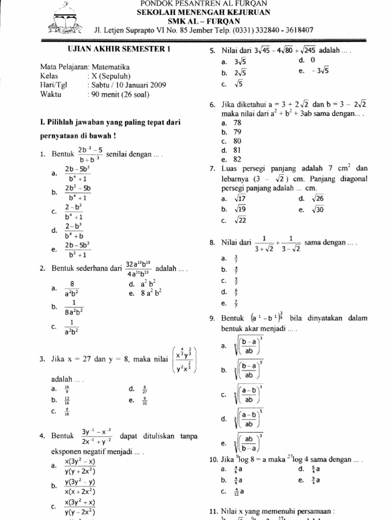 (DOC) SOAL USBN MATEMATIKA SMK KELAS XII | Agus Adibrata ... silahkan request soal dan kunci. SOAL USBN MATEMATIKA SMK KELAS XII 1. Nilai dari 24.34.6-3 adalah... A. 2 B. 4 C. 6 D. 12 E. 18 2.