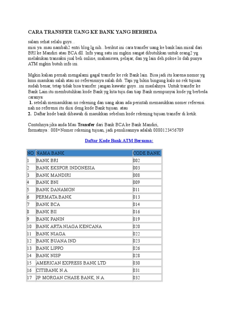 Transfer ke Sesama Account Permata Bank - Cermati.com ...transfer ke antar pengguna Permata Bank, transfer ke anggota jaringan ALTO, ATM Bersama,dan Prima, serta transfer ke bank lain dengan sistem LLG atau RTGS. Berikut ulasan selengkapnya : Transfer ke Sesama Account Permata Bank. Buka aplikasi PermataMobile dan lakukan log in. Tekno 4U All: CARA TRANSFER BEDA BANK MELALUI ATM 4. Pilih/ tekan tombol Transfer ke bank lain atau Transfer ke bank ATM Bersama. 5. Masukkan kode bank dan nomor rekening penerima yang di tuju Kode bank tujuan Lihat daftar kode bank Nomor rekening penerima adalah nomor Yang akan menerima uang anda. Kode Bank Permata & 10 Cara Untuk Transfer Antar Bank 2022 Kode Bank Permata atau Kode Transfer Bank Permata Lengkap dengan Informasi Bagaimana Cara Transfer Antar Bank Beserta Besaran Biaya Admin. 5. Pilih Ke Rek Bank Lain. 6. Input Kode Bank Permata. 7. Input Jumlah Akan Ditransfer. 8. Input Nomor Rekening Tujuan. Cara Transfer ke Sesama Pengguna Rekening CIMB Niaga - Sepulsa Pada dasarnya, cara mentransfer uang dari CIMB Niaga ke rekening bank lain sama seperti saat melakukan transfer ke sesama bank, yang membedakan salah satunya adalah perintah memasukkan kode bank tujuan jika memang Anda melakukan transaksi via mesin Bank Permata Syariah : 784.