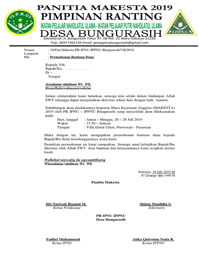 Contoh Surat Permohonan Bantuan Dana Kegiatan yang Benar ... Pemberian bantuan dana dapat diserakan kepada : 1. Panitia Kegiatan. 2. Bendahara Kegiatan. Demikian surat permohonan bantuan ini dibuat. Atas perhatian dan kerjasamanya disampaikan terima kasih. Mudah-mudahan amalan kita semua senantiasa diterima oleh Allah yang maha kuasa. Aamiin.