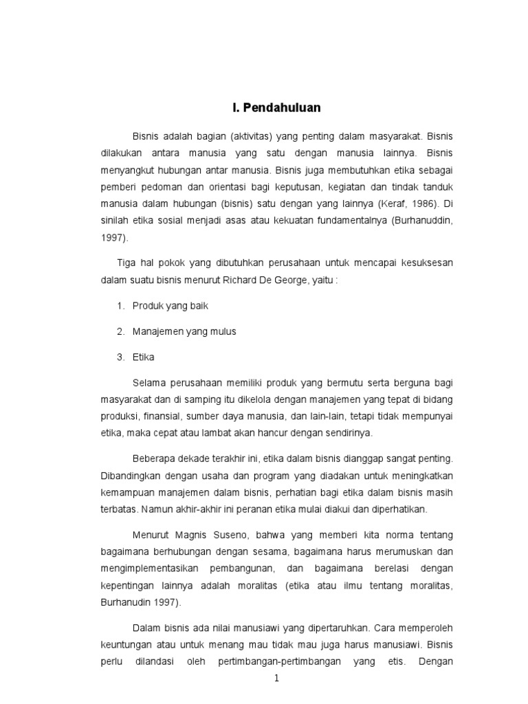 Peran penting etika dan bisnis - Pinhome PERANAN ETIKA BISNIS DALAM BISNIS Bosman Butarbutar ... peranan etika bisnis dalam perusahaan bisnis. Penelitian ini menggunakan metode kajian kepustakaan (library research), dimana kajian didasarkan pada pendapat- pendapat ahli tentang etika bisnis dan peranannya dalam perusahaan. Etika berbisnis ini bisa dilakukan dalam segala aspek. Saling menjaga kepercayaan dalam Etika Bisnis adalah : Pengertian, Peran, manfaat dan ... Sedangkakan pada tingkat mikro, etika bisnis difokuskan pada individu dalam hubungannya dengan ekonomi dan bisnis. Dalam hal ini dipelajari tentang tanggung jawab etis dari karyawan dan atasan, produsen dan konsumen, pemasok dan investor. Peran Etika Berbisnis, Peran Pentingkah Bagi Bisnis Anda? Manfaat menerapkan etika berbisnis pada perusahaan Anda, antara lain: 1) Menciptakan kepercayaan atau loyalitas konsumen 2) Akan mendapatkan image perusahaan yang baik di mata konsumen 3) Karyawan semakin memiliki motivasi yang tinggi. 4) Memberikan keuntungan atau profit bagi perusahaan