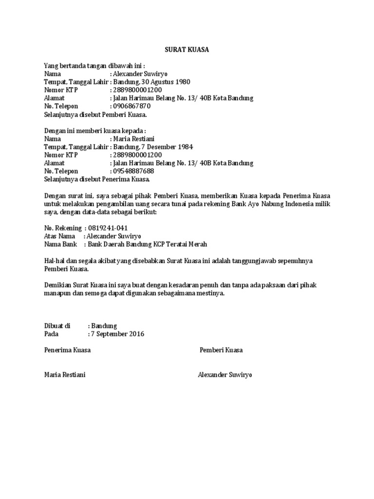 Contoh surat kuasa untuk bank
