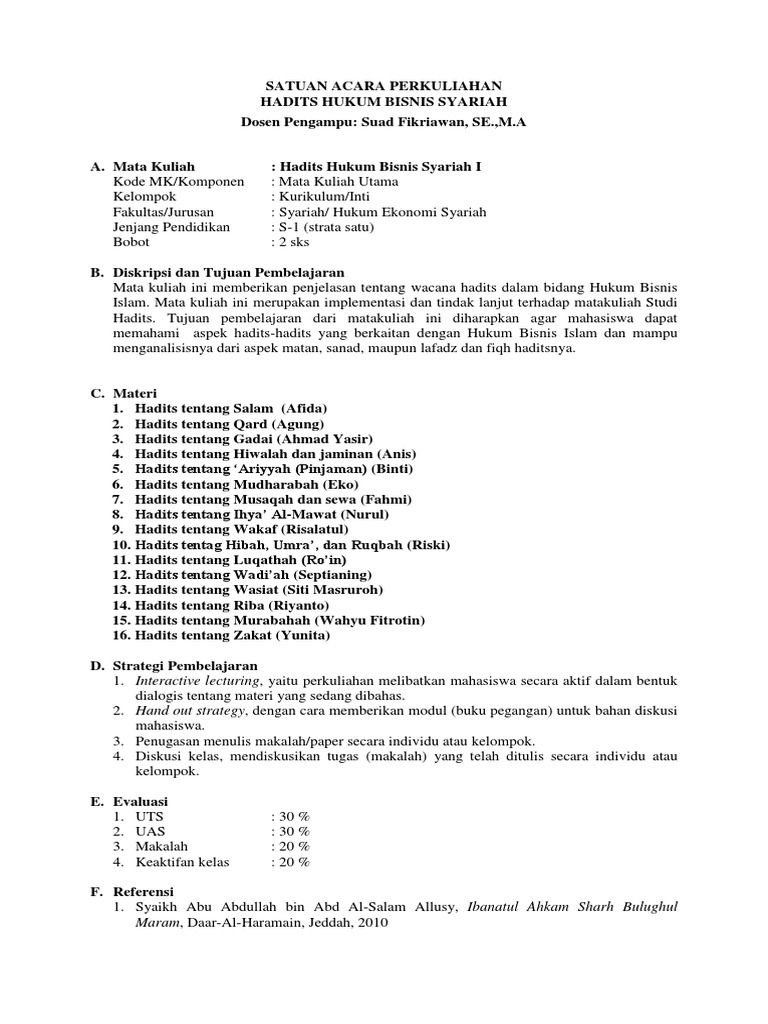 Materi Kuliah - Fakultas Hukum Universitas Gadjah Mada Materi Kuliah - Fakultas Hukum Universitas Gadjah Mada Sebelumnya Selanjutnya Materi Kuliah 17 Maret 2020 Silahkan unduh materi kuliah yg telah disediakan oleh dosen sebagai bahan pendukung belajar mahasiswa. Hukum Perdata (A) Pertemuan Selasa 17/3/2020 (Dr. Ninik Darmini, S.H., M.Hum) materi syarat materiil relatif dan syarat formil PDF Kontrak Perkuliahan, Silabus, Rps Dan Sap : Hukum Bisnis Nama Mata Kuliah : HUKUM BISNIS Kode Mata Kuliah : FEB1007 Dosen : Semester : II 1. DESKRIPSI MATA KULIAH Mata kuliah ini membahas Pengertian Hukum, Perikatan Dan Perjanjian, Hubungan Bisnis, Bentuk-Bentuk Badan Usaha, Asuransi , Surat Berharga, Penanaman Modal Dalam