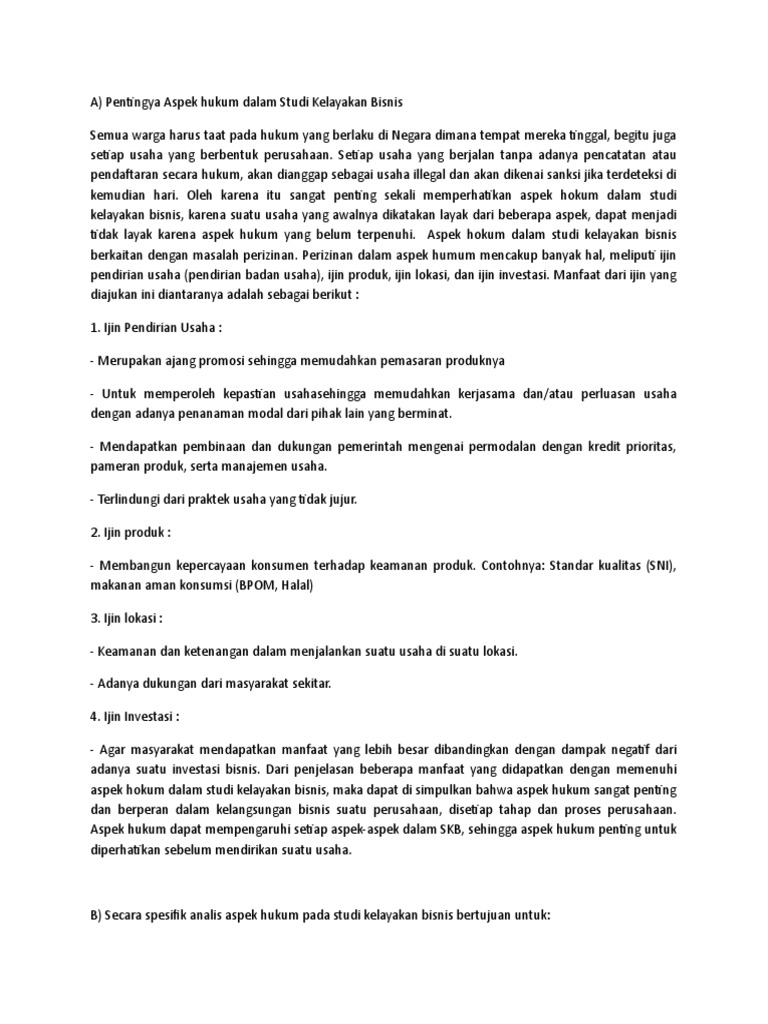 Aspek-aspek Studi Kelayakan Bisnis - Konsultan Bisnis Surabaya Aspek hukum dalam studi kelayakan bisnis menyangkut pada semua hal terkait legalitas rencana bisnis yang hendak dilakukan oleh perusahaan. ASPEK HUKUM DALAM STUDI KELAYAKAN BISNIS - 123dok Berdasarkan aspek hukum, suatu ide bisnis dinyatakan layak jika ide bisnis tersebut sesuai dengan ketentuan hukum dan mampu memenuhi segala persyaratan perizinan di wilayah tersebut. Secara spesifik analisis aspek hukum pada studi kelayakan bisnis bertujuan untuk: a) Menganalisis legalitas usaha yang dijalankan ASPEK HUKUM DALAM STUDI KELAYAKAN BISNIS - 123dok Berdasarkan aspek hukum, suatu ide bisnis dinyatakan layak jika ide bisnis tersebut sesuai dengan ketentuan hukum dan mampu memenuhi segala persyaratan perizinan di wilayah tersebut. Secara spesifik analisis aspek hukum pada studi kelayakan bisnis bertujuan untuk: a) Menganalisis legalitas usaha yang dijalankan