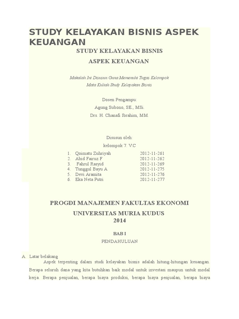 (PDF) Studi Kelayakan Bisnis dalam Rangka Pendirian XX ... Menurut Suliyanto (2010:134), suatu ide Aspek keuangan dalam studi kelayakan bisnis disebut layak berdasarkan aspek bisnis bertujuan untuk: teknis dan teknologi jika berdasarkan hasil a. Menganalisis sumber dana untuk analisis ide bisnis dapat dibangun dan menjalankan usaha. dijalankan dengan baik.