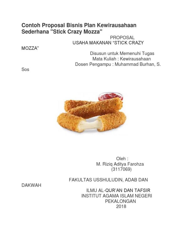 Contoh Proposal Bisnis Plan Kewirausahaan Sederhana "Stick ... Contoh Proposal Bisnis Plan Kewirausahaan Sederhana "Stick Crazy Mozza" ... Bisnis yang akan kami bangun yaitu bisnis makanan siap saji, yang menjadi icon utamanya yaitu stick mozza. Makanan ini terbuat dari bahan utamanya keju mozzarella yang diselimuti oleh adonan kentang.
