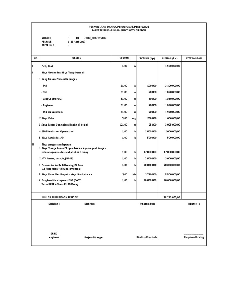 PERUSAHAAN PEMULA BERBASIS TEKNOLOGI - BRIN 59 Lampiran 8: Outline Proposal Gabungan Inkubator dan Tenant. 61 Lampiran 9: Format Business Model Canvas. 62 Lampiran 10: Format Surat Pertanggungjawaban ...73 pages Contoh Surat Pengajuan Anggaran Biaya Lengkap Dan Bisa Di ... form pengajuan dana operasional perusahaan. Surat pengajuan dana ialah seperti contoh surat pengajuan pekerjaan, yang dimana sifatnya resmi dan perlu di tulis dengan kata kata yang baik dan benar. Nah disini admin sudah mengumpulkan semua contoh surat pengajuan anggaran biaya yang dapat kalian pakai sesuai kebutuhan kalian masing masing.