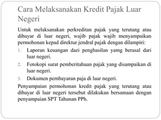 Penghitungan PPh Pada Akhir Tahun - Materi Pajak Kredit Pajak Penghasilan. Kredit pajak yang dapat dikurangkan pada penghitungan PPh Pada Akhir Tahun (UU Nomor 36 Tahun 2008 Pasal 28) Bagi wajib pajak dalam negeri dan Bentuk Usaha Tetap (BUT), pajak yang terutang dikurangi dengan kredit pajak (pajak yang dibayar di muka/prepaid tax) untuk tahun pajak yang bersangkutan, yang terdiri dari :. Baca Juga: Bentuk Usaha Tetap (BUT) Simulasi Menghitung Pajak Penghasilan Pasal 21 (PPh21 ... Tarif PPh21 Berdasarkan Pasal 17 Undang-undang PPh tarif pajak PPh 21 adalah sebagai berikut : Wajib Pajak dengan penghasilan tahunan sampai dengan Rp50.000.000, kena 5% Di atas Rp50.000.000 sampai dengan Rp250.000.000 kena tarif 15% Di atas Rp250.000.000 sampai dengan Rp500.000.000 sebesar 25% Di atas Rp500.000.000, tarif yang dipungut sebesar 30% Kredit Pajak PPh - CARA MENGHITUNG PAJAK PENGHASILAN • Kredit Pajak Dalam Negeri 1) Pemotongan PPh Pasal 21 Ketentuan ini mengatur tentang pembayaran pajak dalam tahun berjalan melalui pemotongan pajak atas penghasilan yang diterima atau diperoleh oleh Wajib Pajak orang pribadi dalam negeri sehubungan dengan pekerjaan, jasa, dan kegiatan. 109 | H a l a m a n a) Pemotong PPh Pasal 21 Begini Cara Menghitung PPh 21 Bagi Suami Dan Istri Bekerja Kredit pajak PPh 21: 1.300.000: PPh kurang bayar: 977.778: Angsuran PPh 25 Tahun Pajak Berikutnya (Rp 977.778 : 12 bulan) = Rp 81.482 /bulan. [Baca Juga: Informasi PPh 21 di Website Resmi Pajak.go.id yang Harusnya Sudah Kamu Ketahui] Cara Pengisian SPT: