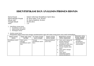 Analisis Sistem Informasi - Uksw • Fase analisis sistem adalah fase profesional sistem melakukan kegiatan analisis sistem. • Laporan yang dihasilkan menyediakan suatu landasan untuk membentuk suatu tim proyek sistem dan memulai fase analisis sistem. • Tim proyek sistem memperoleh pengertian yang lebih jelas tentang alasan untuk mengembangkan suatu sistem baru. Analisa Proses Bisnis - Diznet Indo Zahira Analisis Proses Bisnis adalah Kajian yang dilakukan untuk mengetahui urutan pelaksanaan dalam suatu organisasi yang bertujuan untuk mendapatkan keuntungan dengan menggunakan berbagai sumber daya. Analisis proses bisnis umumnya melibatkan pemetaan proses dan subproses di dalamnya hingga tingkatan aktivitas atau kegiatan. Karakteristik Proses Bisnis