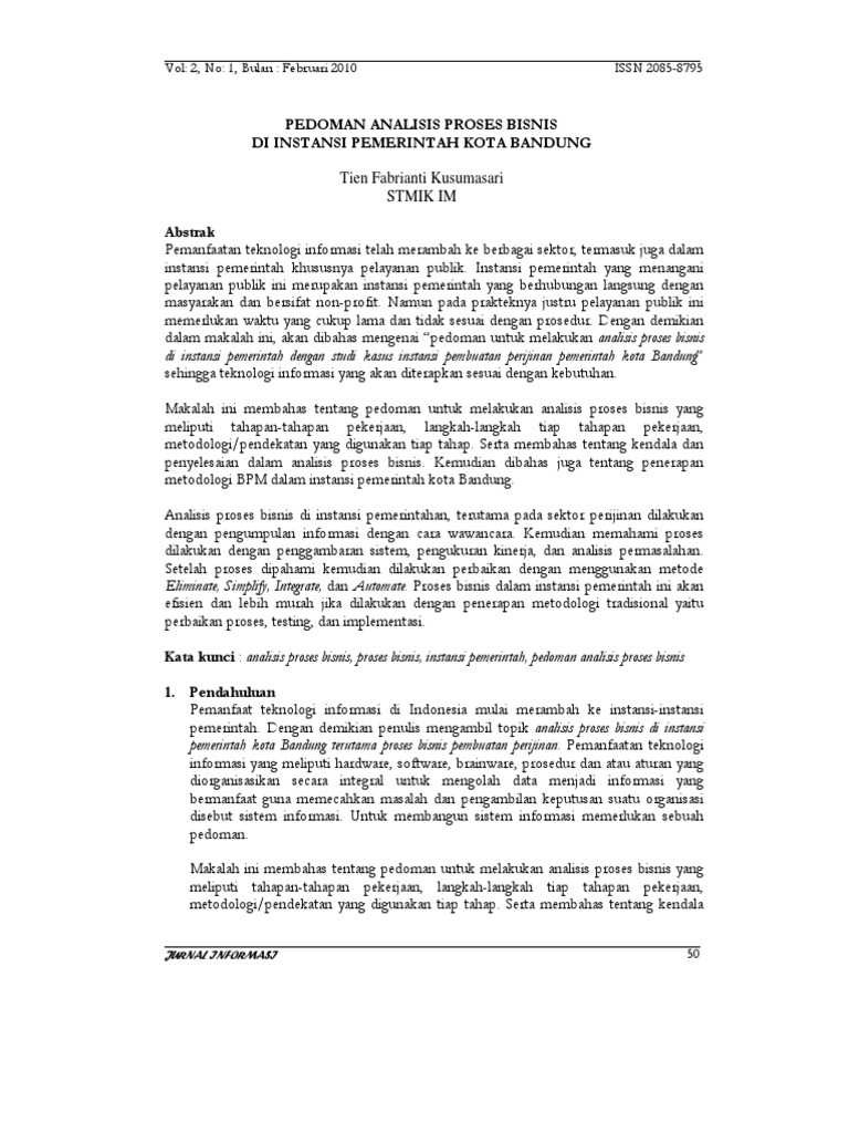 Analisis Proses Bisnis Sistem Informasi Administrasi ... tujuan dari penelitian ini adalah untuk mengetahui gambaran atau kondisi proses bisnis sistem informasi administrasi skripsi program studi ilmu administrasi bisnis fakultas ilmu administrasi universitas brawijaya (psiab fia ub) saat ini, melakukan analisis proses bisnis sistem informasi administrasi skripsi saat ini, dan menggambarkan serta … PDF Analisis Proses Bisnis Pada Percetakan Bhinneka Riyant Analisis Proses Bisnis Analisis proses bisnis adalah sebuah analisis dan pemodelan proses bisnis untuk perbaikan dan otomatisasi. Analisis proses bisnis digunakan untuk meningkatkan kinerja suatu perusahaan. Menurut Andersen (2007, p.3) peningkatan kinerja diperlukan karena alasan berikut: a. Banyak isu baik eksternal maupun PDF Pemodelan Proses Bisnis Sistem Informasi Analisis Apbd ... PEMODELAN PROSES BISNIS SISTEM INFORMASI ANALISIS APBD DENGAN BUSINESS PROCESS MODELLING NOTATION (BPMN) Assistriadi Widjiseno1 1Program Studi Teknik Informatika, Fakultas Teknik, Universitas Kahuripan Kediri Jalan Soekarno-Hatta No.1 Pelem Pare Kediri 64121, Telp/Fax: (0354) 391977 Proses Bisnis Sistem Informasi - Indra020890's Blog Proses Bisnis Sistem Informasi Proses bisnis adalah serangkaian atau sekumpulan aktifitas yang dirancang untuk menyelesaikan tujuan strategik sebuah organisasi, seperti pelanggan dan pasar (Hollander, Denna, dan Cherrington, 2000). Proses bisnis memiliki beberapa karakteristik antara lain (Sparx System, 2004) 1. Memiliki tujuan 2.
