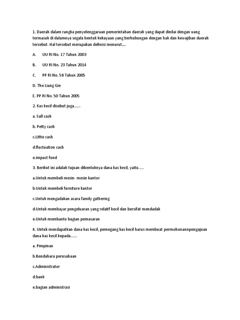 Soal Pilihan Ganda Dan Jawabannya Tentang Dana Kas Kecil ... pilihan ganda 1.kas kecil disebut juga....... a.small cash b.petty cash c.littie cash d.fluctuation cash e.impact fund 2.berikut ini adalah tujuan dibentuknya dana kas kecil, yaitu..... a.untuk membeli mesin- mesin kantor b.untuk membeli furniture kantor c.untuk mengadakan acara family gathering d.untuk membayar pengeluaran yang relatif kecil dan …