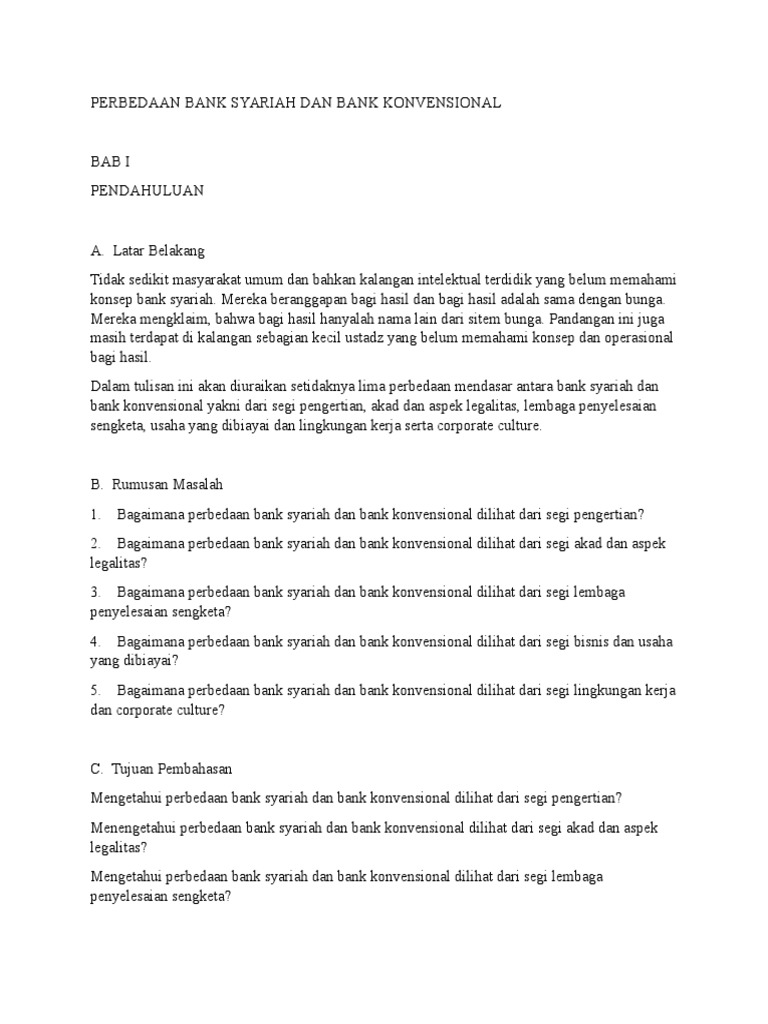 Ulasan Perbedaan Bank Syariah dan Bank Konvensional ... Perbedaan utama dari bank konvensensional dan bank syariah selain dari pelayanannya juga dari istilah bunga dan bagi hasil yang di pakai di masing-masing bank. Istilah bank mungkin lebih sering didengar di telinga masyarakat Indonesia. Pahami 5 Perbedaan Bank Syariah Dan Konvensional Sementara, bank konvensional adalah lembaga keuangan yang mengacu pada perjanjian antara kreditur dan nasabah bank. Bank syariah adalah bank yang berorientasi pada nilai kehalalan sesuai aturan agama Islam. Sedangkan, bank konvensional adalah jenis bank yang menjalankan operasionalnya secara bebas tanpa terikat agama tertentu. Click to Tweet Perbedaan Bank Konvensional Dan Bank Syariah - Harian Muslim Pada bank konvensional, lembaga yang berfungsi mengawasi hanya dewan komisaris. Sedangkan pada bank syariah, selain dewan komisaris, terdapat pula dewan pengawas syariah yang ada pada setiap bank dengan fungsi dan tanggung jawab untuk memastikan bahwa operasional perbankan benar-benar telah sesuai dengan syariah. (DOC) Perbedaan Bank Konvensional Dengan Bank Syariah ... Perbedaan Bank Konvensional Dengan Bank Syariah Bank syariah adalah bank yang beroperasi berdasarkan syariah atau prinsip agama Islam. Sesuai dengan prinsip Islam yang melarang sistem bunga atau riba yang memberatkan, maka bank syariah beroperasi berdasarkan kemitraan pada semua aktivitas bisnis atas dasar kesetaraan dan keadilan.